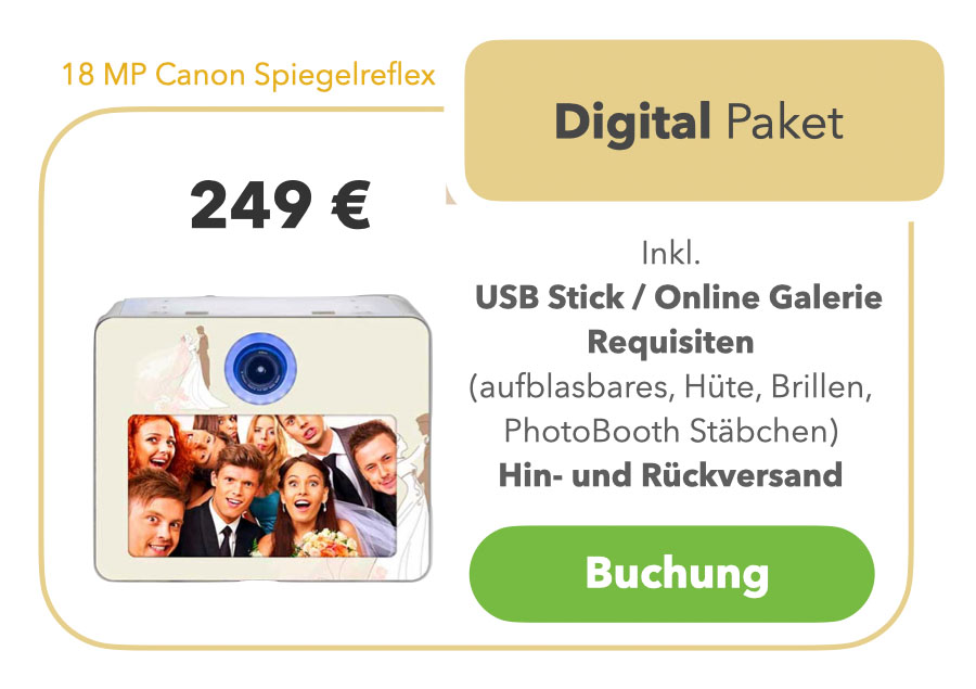 Was sagst du, wie wäre es mit einer Fotobox für deinen Geburtstag? Langeweile bei deiner Party kommt damit garantiert nicht auf. Das Mieten ist ganz einfach: Triff online deine Auswahl, bestimme das Design und gib deine Lieferadresse an. Dann bekommst du die Fotobox pünktlich geliefert. Die Versandkosten tragen wir. Um die Fotobox für deinen Geburtstag, deine Hochzeit oder deine Weihnachtsfeier startklar zu machen, nutzt du einfach die bebilderte Anleitung. Damit funktioniert es kinderleicht. Nach der Feier sendest du die Photo Booth versandkostenfrei an uns zurück. Auf die Fotos kannst du noch 60 Tage lang in der Online-Galerie zugreifen. Mit unserer tollen Fotobox wird deine nächste Feier zum Geburtstag, zur Hochzeit oder zu einem ganz anderen Anlass garantiert ein voller Erfolg!