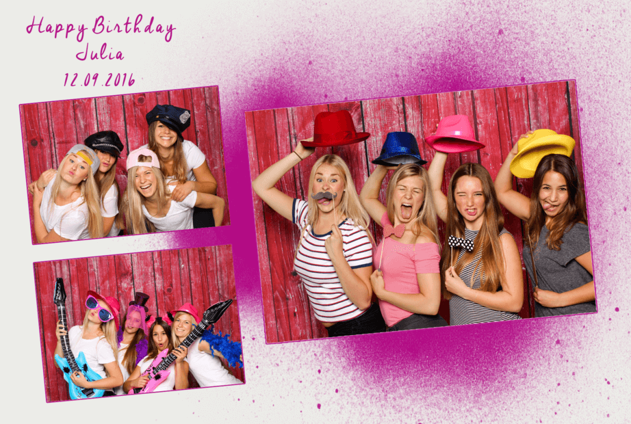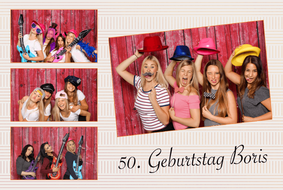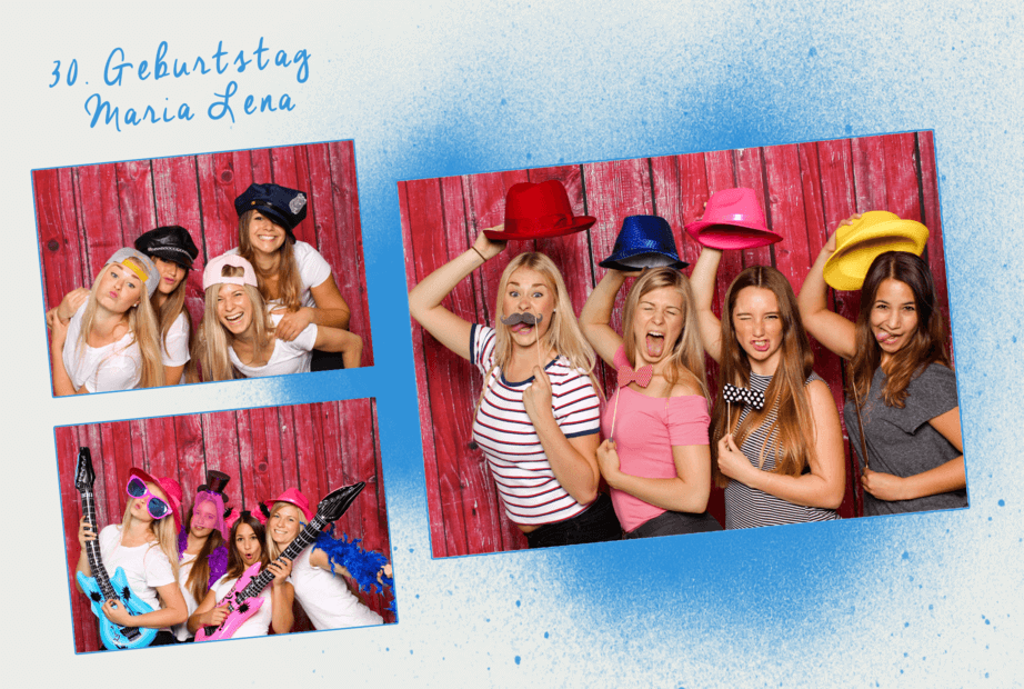 Mit der Druck-Flat werden deine Fotos direkt auf der Party genau so ausgedruckt (4 Aufnahmen auf einem Foto mit Design deiner Wahl) – nonstop hintereinander.