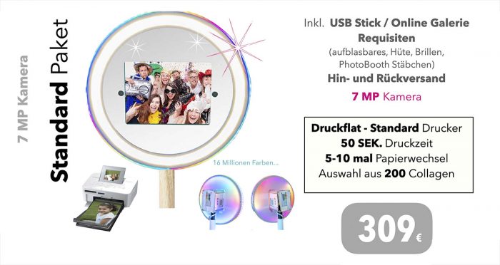Mit unserem Paket „Fotobox L Standard“ erhälst Du eine Requisitenbox ( Hüte, Brillen, aufblasbares, Photo Booth Stäbchen), USB-Stick, Aufgabenkarten und wenn gewünscht eine kostenlose Online Galerie für deine Gäste.