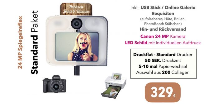 Mit unserem Paket „Fotobox S 24 MP Standard“ erhälst Du eine Requisitenbox ( Hüte, Brillen, aufblasbares, Photo Booth Stäbchen), USB-Stick, Aufgabenkarten und wenn gewünscht eine kostenlose Online Galerie für deine Gäste.